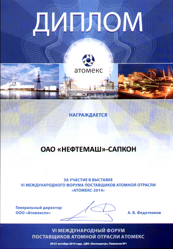 Диплом за участие в выставке "Атомекс-2014"