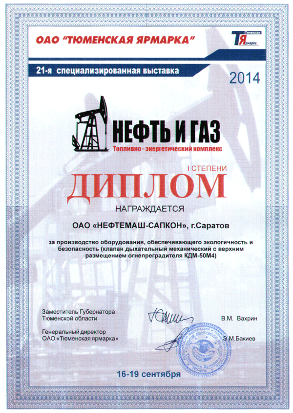 Диплом за производство оборудования. Обеспечивающего экологичность и безопасность (клапан дыхательный механический с верхним расположением огнепреградителя КДМ-50М4).