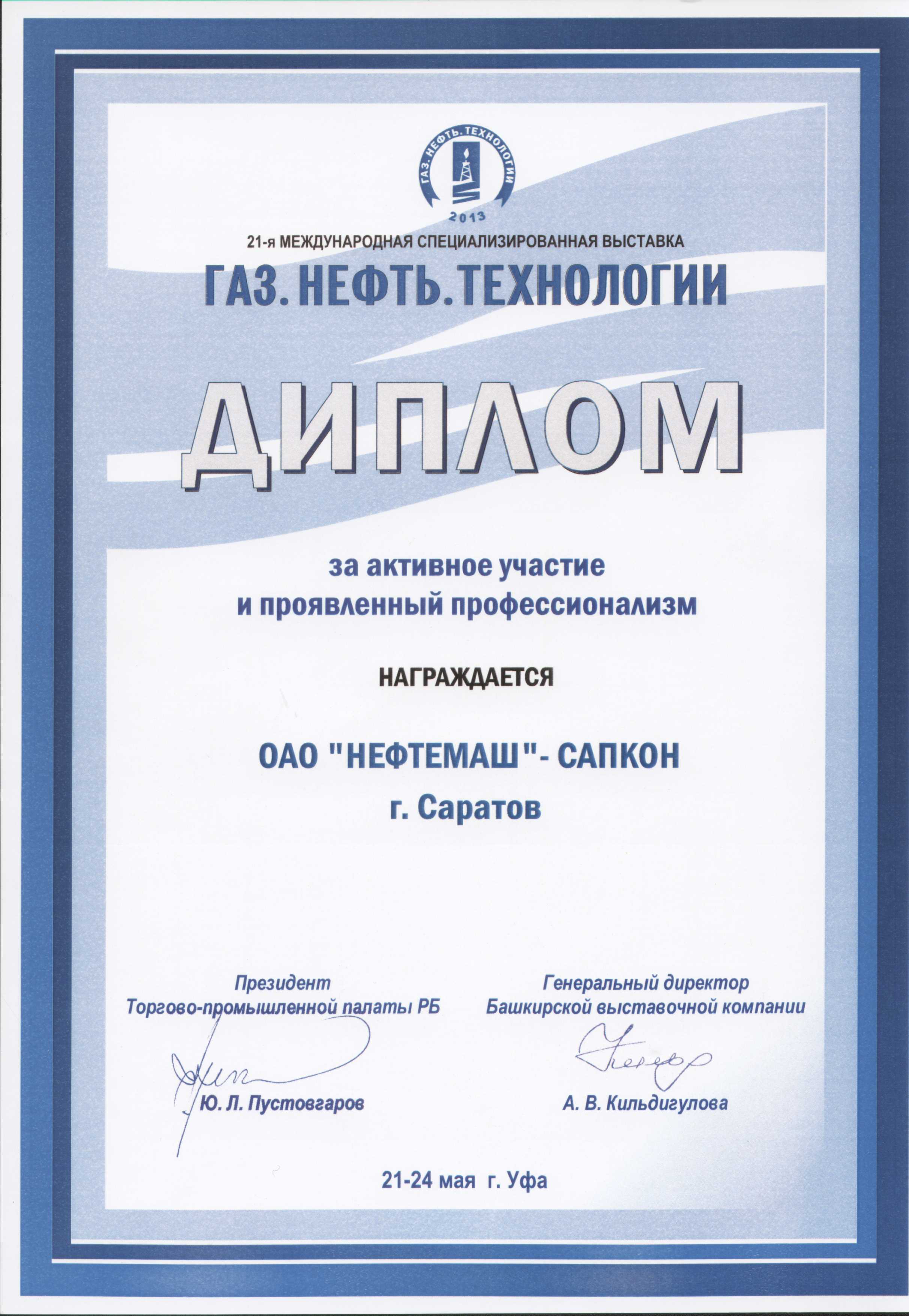 Диплом за участие в выставке "НЕФТЬ.ГАЗ.ХИМ"