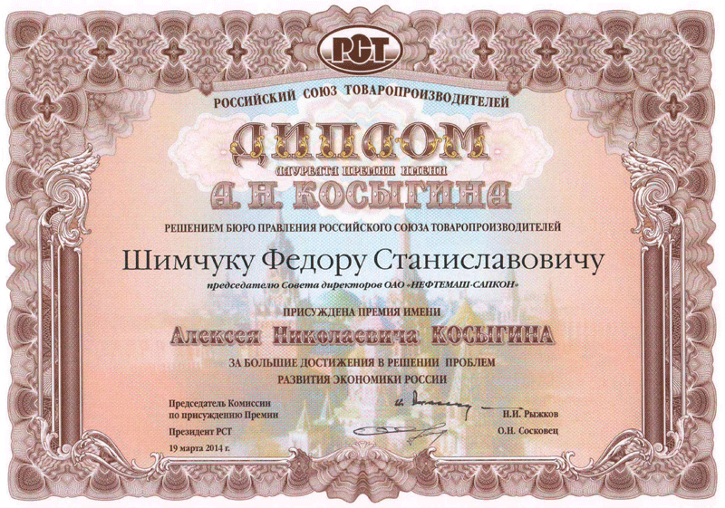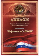 За большие достижения АО "НЕФТЕМАШ" - САПКОН в решении проблем развития экономики России Российский Союз Товаропроизводителей (Рыжков Н. И.) в 2003 году вручил предприятию Диплом Лауреата премии имени А. Н. Косыгина.