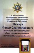Высшим Орденом общественного признания «Почетный Гражданин России» награжден Шимчук Ф.С.