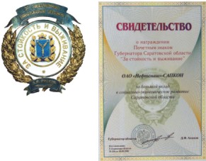 За большой вклад в социально-экономическое развитие саратовской области, предприятию АО "Нефтемаш" -САПКОН, вручено свидетельство и почетный знак Губернатора Саратовской области "За стойкость и выживание".